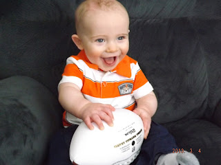 Not sure what his weight or height is but I do know he is growing and getting heavier to carry around each day. He is still in size 3 diapers and is wearing 9 month clothes. He still loves his bath time, his food, mickey mouse clubhouse, to have his blanket over his face when he sleeps, nap time. He is sleeping good still so i can't complain; he wakes up around 6 and wants to have a bottle and then will go back to sleep. He has figured out how to hold his bottle by himself; he takes it out and looks at it then gets mad and shoves it back into his mouth getting milk all over his face. He is really starting to talk and babble a ton; i can't wait til he can actually say some words. We are still working on crawling on his hands and knees, waving bye bye, and gettin the concept of moving his feet and walking. Here is to another month that has come and gone and for many more changes to come and time that goes by too fast. Love you so much Wytten Jay!!