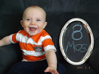 I can't believe my cute blue eyed little man is already 8 months old, before we know it he will be a yr old. This month has brought some new things in this chubby mans life: he had his first poop incident in his high chair, he got his first tooth, he tried cream of chicken soup from maddox (gobbled it right up), he officially is getting into everything and can get to where ever he would like to go, thinks he can drink the water out of the tub when he is bathing, found out he has parts down there and plays with them when in the tub and getting his bum changed, would rather play with tykes toys than his own, and can throw a good fit when he doesn't want to eat the food I made for him. He also tried some new foods this month besides the cream of chicken soup he had mangos, squash, blueberry and bananas, apple pear and bananas, strawberry apple and pear. When it comes to food he definitely is a momma's boy and loves his fruit and not so much a fan of all the veggies.